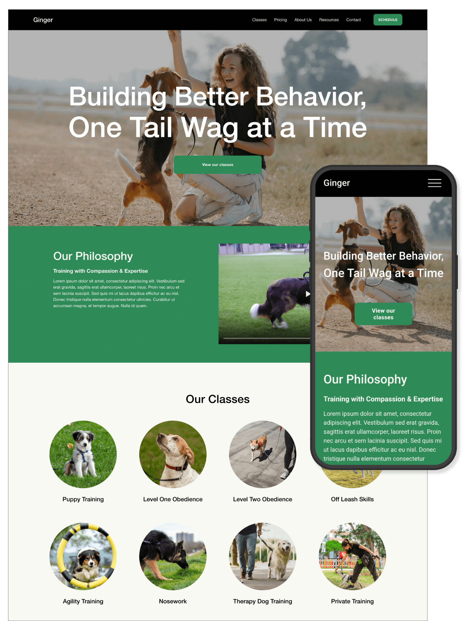 The Ginger template balances elegant design with practical features: class promotion, credibility builders, content marketing, and lead capture, to help your dog-focused business turn website visitors into loyal clients.
