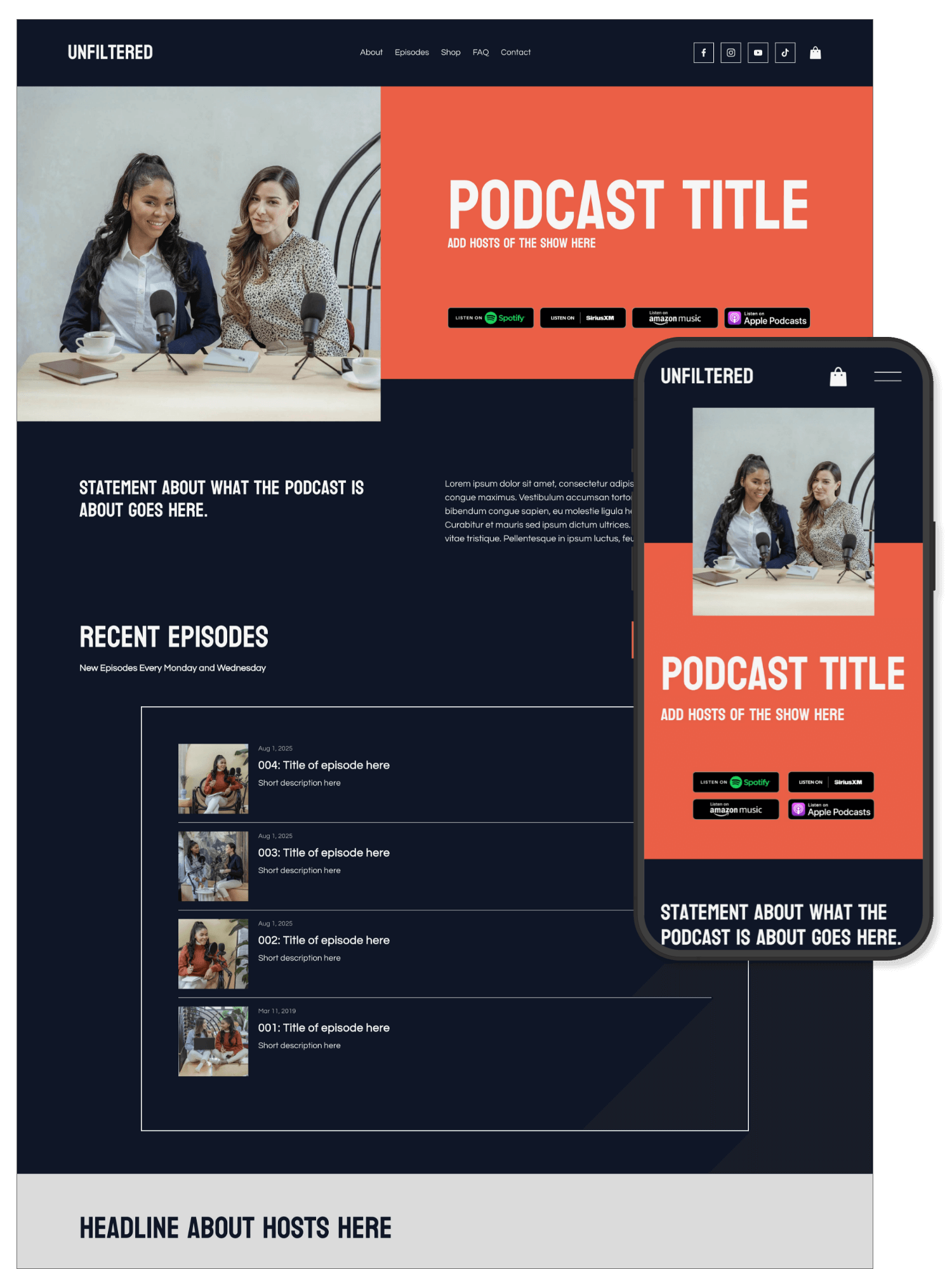 The Unfiltered template offers a clean, modern design perfect for podcasters looking to showcase their content. It features a bold, dynamic layout with easy-to-navigate episode listings, a customizable player for seamless listening, and integrated social media links to help grow your audience.